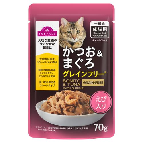 ポイント 2倍96個セット トップバリュ キャットフードパウチ かつお&まぐろ グレインフリー えび入り 70g