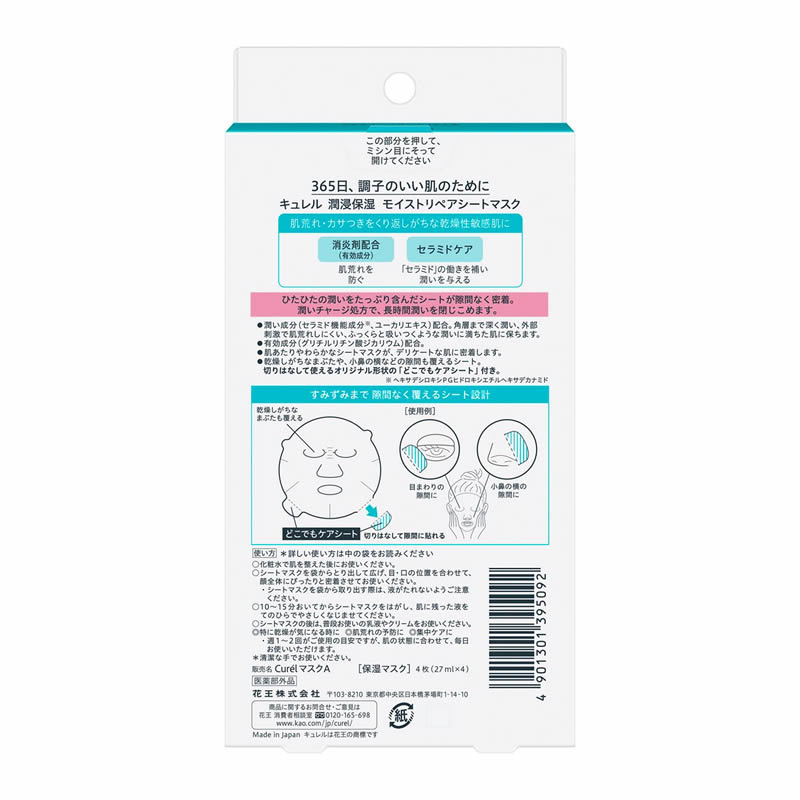 潤いひたひたでやさしい感触のシートでじっくりとケアして、セラミドの働きを補い、濃密な潤いをすみずみまで補給。潤いチャージ処方で、長時間潤いを閉じこめる。●消炎剤(有効成分)配合。肌荒れを防ぐ。●肌あたりやわらかなシートマスクが、デリケートな肌に密着。●乾燥しがちなまぶたや、小鼻の横などの隙間も覆えるシート。切りはなして使えるオリジナル形状の「どこでもケアシート」付き。(医薬部外品)