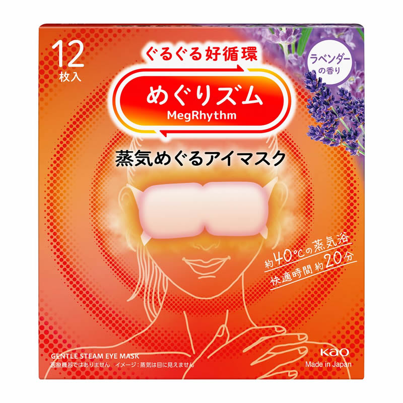 ぐるぐる好循環!蒸気めぐるアイマスク。『蒸気めぐり設計』で気分までときほぐれて心地よさめぐる。お風呂のような心地よさ約40度。快適時間約20分。蒸気を溜め込む保温性約1.5倍(当社従来品比)極厚やわらか不織布。ふくらんで密着フィット●働き続けた目に蒸気をふんだんに●開封するだけで温まる●男女兼用サイズ●ラベンダーの香り(香料中に天然エッセンシャルオイルをブレンド)●様々な場面で、毎日のめぐり習慣に