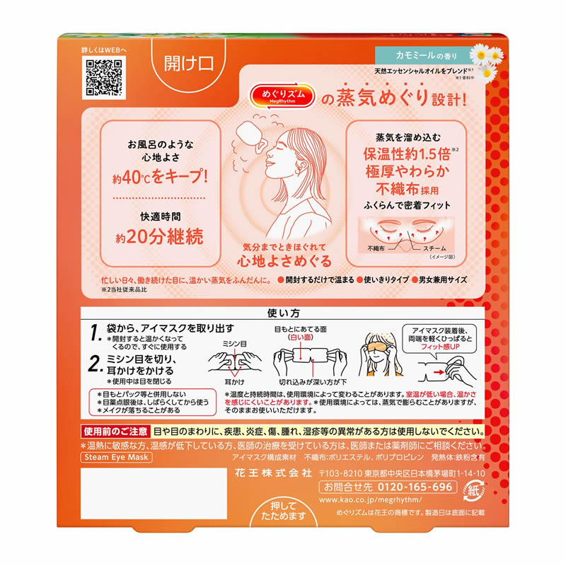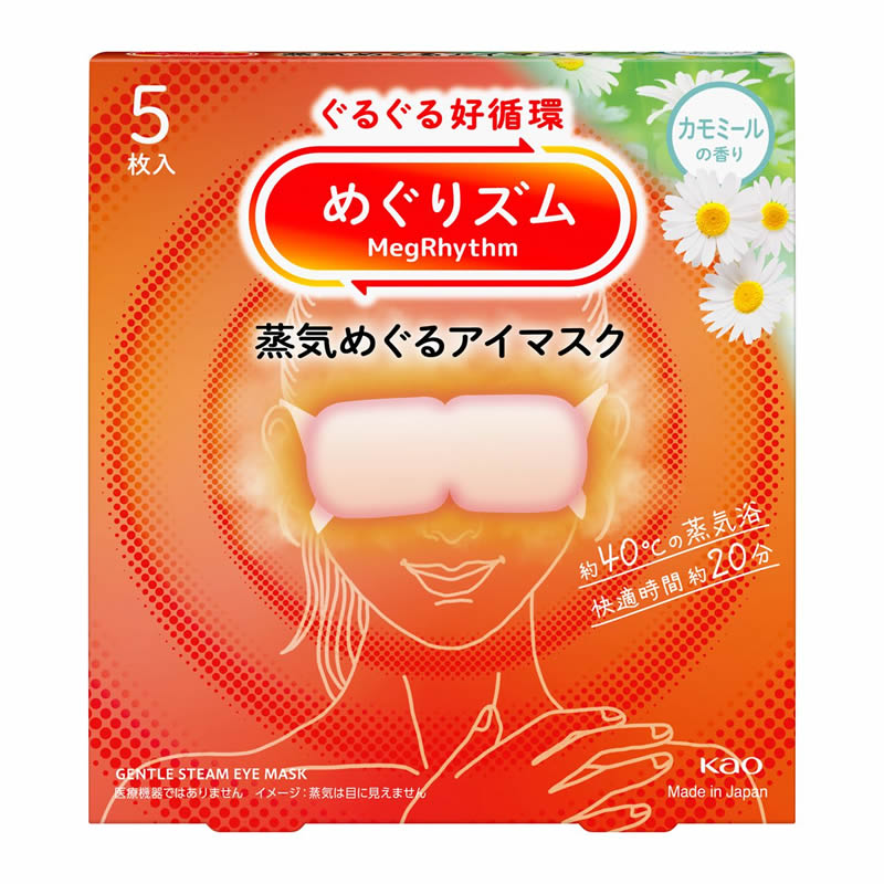 ぐるぐる好循環!蒸気めぐるアイマスク。『蒸気めぐり設計』で気分までときほぐれて心地よさめぐる。お風呂のような心地よさ約40度。快適時間約20分。蒸気を溜め込む保温性約1.5倍(当社従来品比)極厚やわらか不織布。ふくらんで密着フィット●働き続けた目に蒸気をふんだんに●開封するだけで温まる●男女兼用サイズ●カモミールの香り(香料中に天然エッセンシャルオイルをブレンド)●様々な場面で、毎日のめぐり習慣に