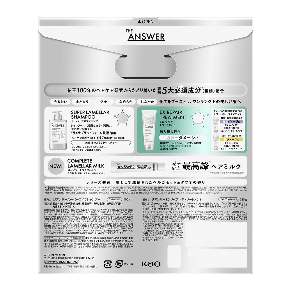 *1 【花王開発成分】セラミドα(ビスメトキシプロピルアミドイソドコサン)、イソステアリン酸コレステリル、ポリシリコーン-9【他】加水分解ケラチン(羊毛)、リンゴ酸、ラノリン脂肪酸、脂肪グリセリドα(オリーブ果実油)、イソステアリン酸、PCA、PCA-Na、乳酸、乳酸Na、ジラウラミドグルタミドリシンNa、γ-ドコサラクトン *2 Hydrolyzed Keratin:加水分解ケラチン(羊毛)、Ceramide α:セラミドα(ビスメトキシプロピルアミドソドコサン)、Malic Acid:リンゴ酸、Lanolin Acid:ラノリン脂肪酸、Fatty Acid Glyceride α:脂肪酸グリセリドα(オリーブ果実油) *3 ラノリン脂肪酸、セラミドα(ビスメトキシプロピルアミドイソドコサン) *4 THE ANSWERトリートメン内において