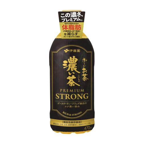 「この濃さ プレミアム。」濃さを極めたPREMIUM STRONG。コク深い渋みだけでなく、濃い旨みも引き立てた、もっと濃い濃い茶。究極の濃さと後味に残らないキレの良さを両立。BMIが高めの方の 「体脂肪(内臓脂肪と皮下脂肪)を減らす」