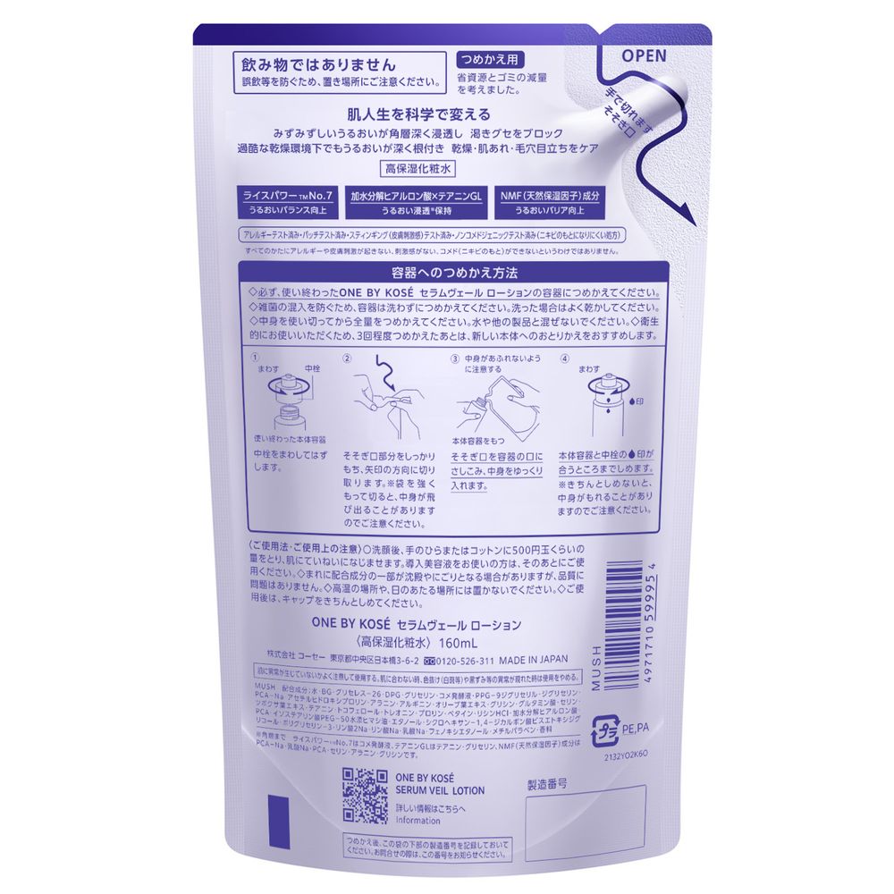 ONE BY KOSE セラムヴェール ローション (つめかえ用) (高保湿化粧水) 160mL : うるおい持久力を向上。渇きグセを防ぎもっちり潤密肌へ。保湿成分ライスパワーTM配合。肌人生を科学で変える。みずみずしいうるおいが角層深く浸透し、渇きグセをブロック。過酷な乾燥環境下でもうるおいが深く根付き、乾燥・肌あれ・毛穴目立ちをケア。ライスパワーTM No.7 : うるおいバランス向上。加水分解ヒアルロン酸×テアニンGL : うるおい浸透 (角層まで) 保持。NMF (天然保湿因子) 成分 : うるおいバリア向上。アレルギーテスト済み、パッチテスト済み、スティンギング (皮膚刺激感) テスト済み、ノンコメドジェニックテスト済み (ニキビのもとになりにくい処方) 。すべてのかたにアレルギーや皮膚刺激が起きない、刺激感がない、コメド (ニキビのもと) ができないというわけではありません。