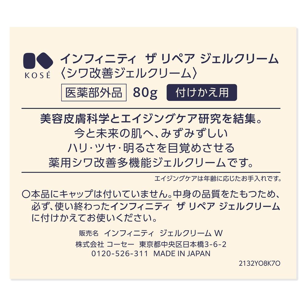 インフィニティ ザ リペア ジェルクリーム (付けかえ用) (シワ改善ジェルクリーム) (医薬部外品) 80g : 美容皮膚科学とエイジングケア研究を結集。今と未来の肌へ、みずみずしいハリ・ツヤ・明るさを目覚めさせる薬用シワ改善多機能ジェルクリームです。エイジングケアは年齢に応じたお手入れです。本品にキャップは付いていません。中身の品質をたもつため、必ず、使い終わったインフィニティ ザ リペア ジェルクリームに付けかえてお使いください。