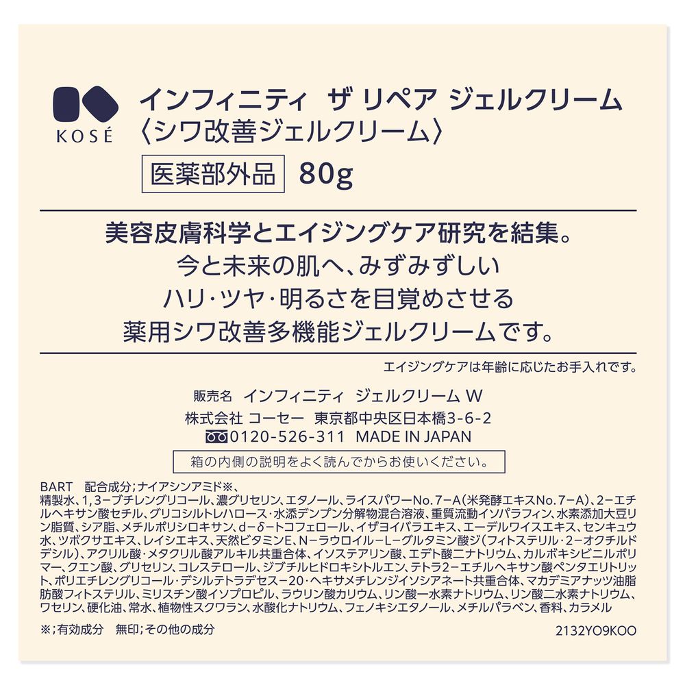 インフィニティ ザ リペア ジェルクリーム (シワ改善ジェルクリーム) (医薬部外品) 80g : 美容皮膚科学とエイジングケア研究を結集。今と未来の肌へ、みずみずしいハリ・ツヤ・明るさを目覚めさせる薬用シワ改善多機能ジェルクリームです。エイジングケアは年齢に応じたお手入れです。シワ改善。アレルギーテスト済み : すべてのかたにアレルギーが起きないというわけではありません。角層細胞の一つひとつをふっくらうるおわせ、油水分バランスのとれたはつらつとした肌へみちびきます。忙しいときや、シンプルなお手入れをしたいとき、みずみずしい保湿力が欲しいときなどマルチに使えます。付けかえ用があります。容器・キャップ・スパチュラは捨てないでください。