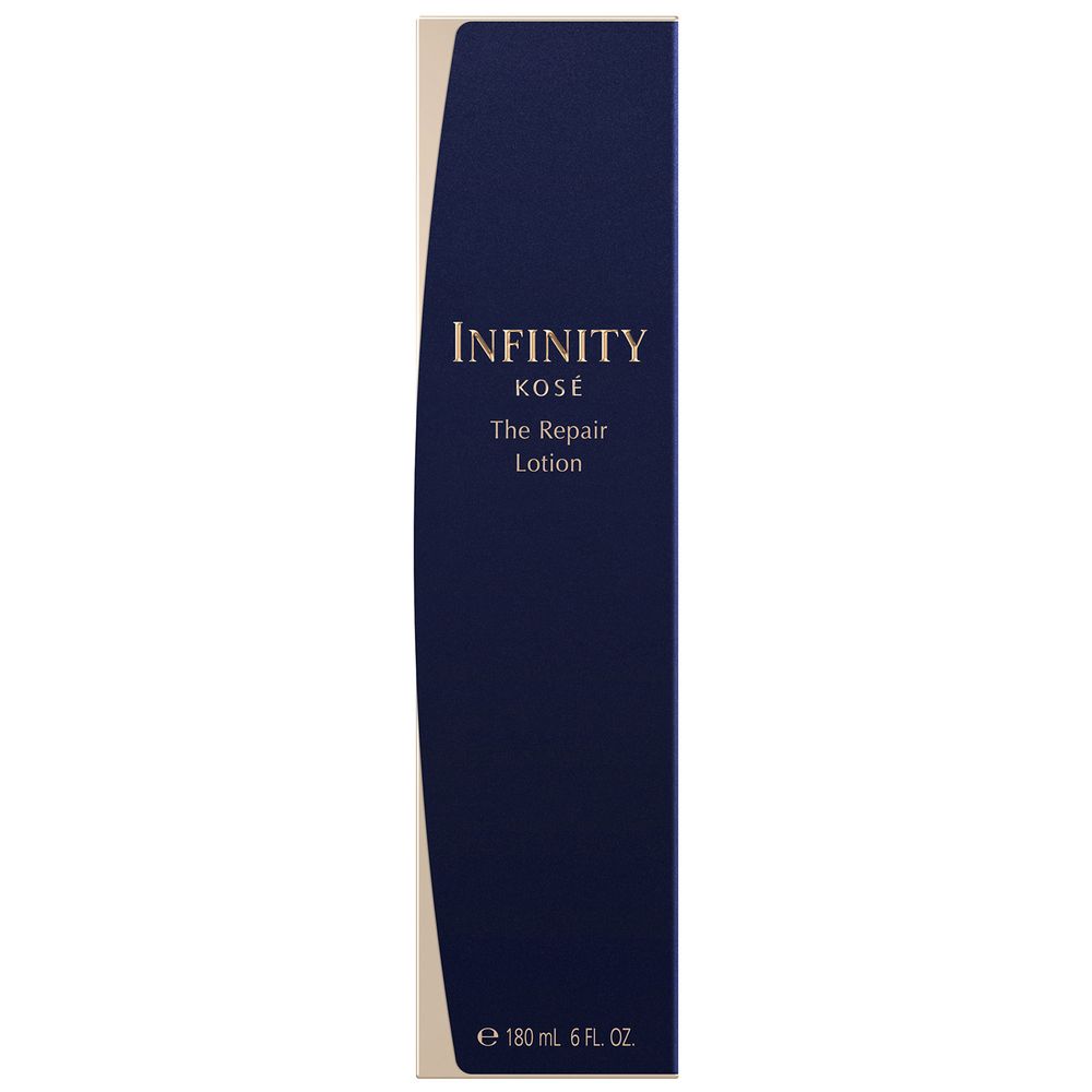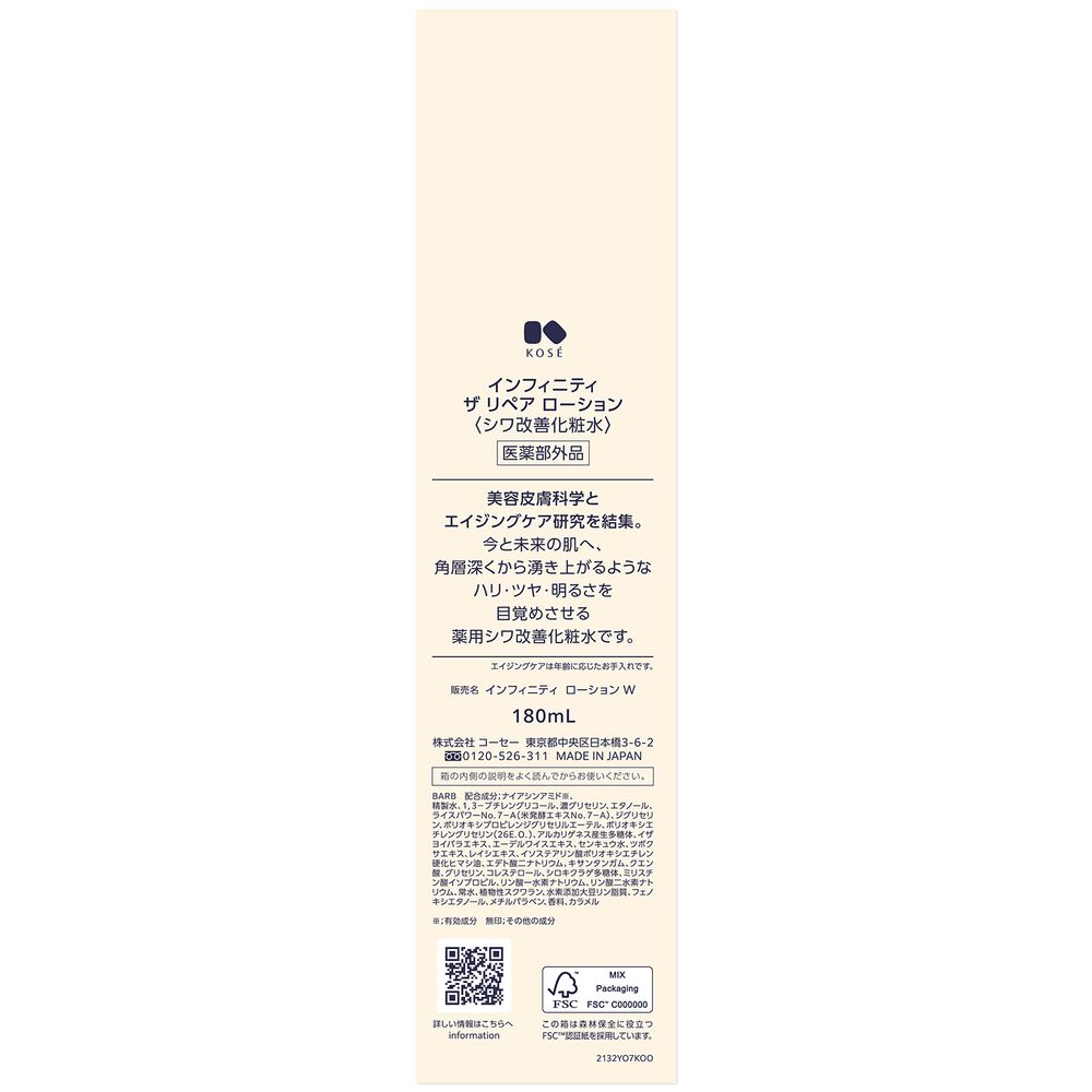 インフィニティ ザ リペア ローション (シワ改善化粧水) (医薬部外品) 180mL : 美容皮膚科学とエイジングケア研究を結集。今と未来の肌へ、角層深くから湧き上がるようなハリ・ツヤ・明るさを目覚めさせる薬用シワ改善化粧水です。エイジングケアは年齢に応じたお手入れです。シワ改善有効成分 : ナイアシンアミド配合。保湿成分 : ライスパワーTM No.7高濃度配合。エーデルワイスエキス、センキュウ水、ゴツコラ (ツボクサ) エキス、レイシエキスイザヨイバラエキス、グリセリン配合。ハリ感アップ成分 : スキンフュージョニングエレメント配合。高濃度はコーセー内比です。シワ改善。アレルギーテスト済み : すべてのかたにアレルギーが起きないというわけではありません。上質なうるおいを角層細胞の一つひとつへ注ぎ込み、乾燥・肌あれを防ぎます。油水分バランスのとれた、柔軟な肌へみちびきます。つめかえ用があります。
