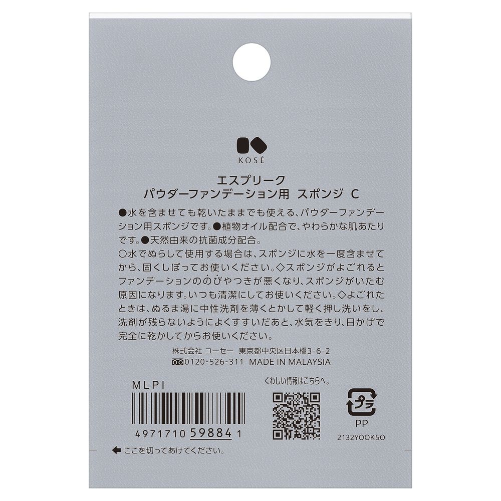エスプリーク パウダーファンデーション用 スポンジ C : 水を含ませても乾いたままでも使える、パウダーファンデーション用スポンジです。植物オイル配合で、やわらかな肌あたりです。天然由来の抗菌成分配合。