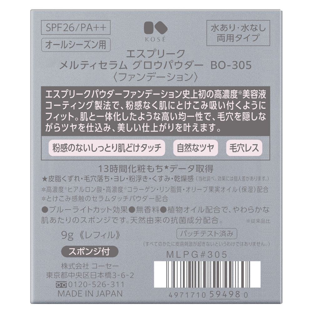 エスプリーク メルティセラム グロウパウダー (レフィル) BO-305 (ファンデーション) 9g : スポンジ付。SPF26/PA++。オールシーズン用。水あり・水なし両用タイプ。ベージュオークル 305。高濃度 (従来品比) 美容液コーティング製法。ツヤどけパウダー。エスプリークパウダーファンデーション史上初の高濃度 (従来品比) 美容液コーティング製法で、粉感なく肌にとけこみ吸い付くようにフィット。肌と一体化したような高い均一性で、毛穴を隠しながらツヤを仕込み、美しい仕上がりを叶えます。粉感のないしっとり肌どけタッチ。自然なツヤ。毛穴レス。13時間化粧もち (皮脂くずれ・毛穴落ち・ヨレ・粉浮き・くすみ・乾燥感 (当社調べ。効果には個人差があります。) ) データ取得。高濃度 (従来品比) ヒアルロン酸・高濃度 (従来品比) コラーゲン・リン脂質・オリーブ果実オイル (保湿) 配合。とけこみ感触のセラムタッチパウダー配合。ブルーライトカット効果。無香料。植物オイル配合で、やわらかな肌あたりのスポンジです。天然由来の抗菌成分配合。パッチテスト済み (すべてのかたに皮膚刺激が起きないというわけではありません。) 。
