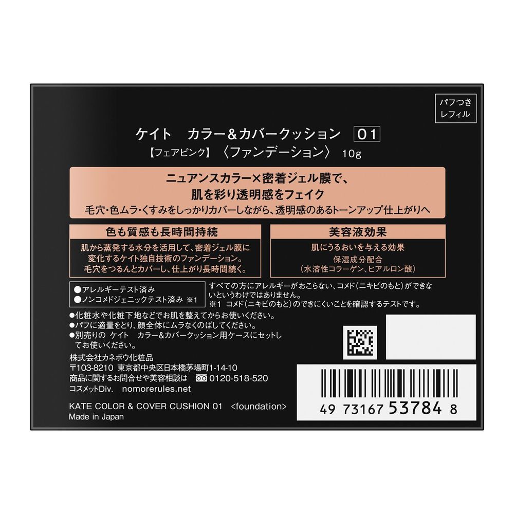 ニュアンスカラー×密着ジェル膜で、肌を彩り透明感をフェイクするクッションファンデーション。毛穴・色ムラ・くすみをしっかりカバーしながら、透明感のあるトーンアップ仕上がりへ。 ■肌から蒸発する水分を活用して密着ジェル膜に変化するケイト独自技術で、色も質感も長時間持続 ■肌にうるおいを与える美容液効果 保湿成分配合(水溶性コラーゲン、ヒアルロン酸) ■パフ付きレフィル