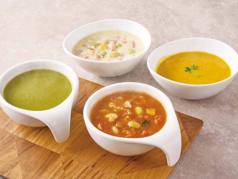 ポタージュ(とうもろこし×2・10種野菜・じゃがいもの旨み濃厚ヴィシソワーズ・北海道産かぼちゃ)各180g、具沢山スープ(クリームチャウダー・15品目のミネストローネ)各230g