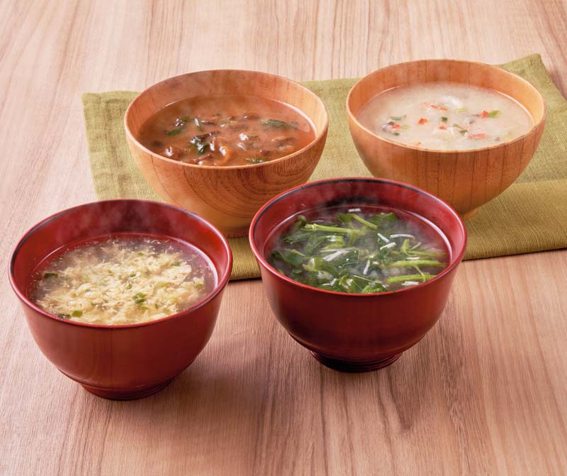おみそ汁(わかめ8.5g×2・豚汁11.1g×2・赤だしなめこ8.4g×2・焼なす8.5g・豆腐とねぎ9.7g・あおさ8.1g・かに9.5g)、お吸い物(ふわっと玉子6.7g・ねばり野菜7.6g)×各2