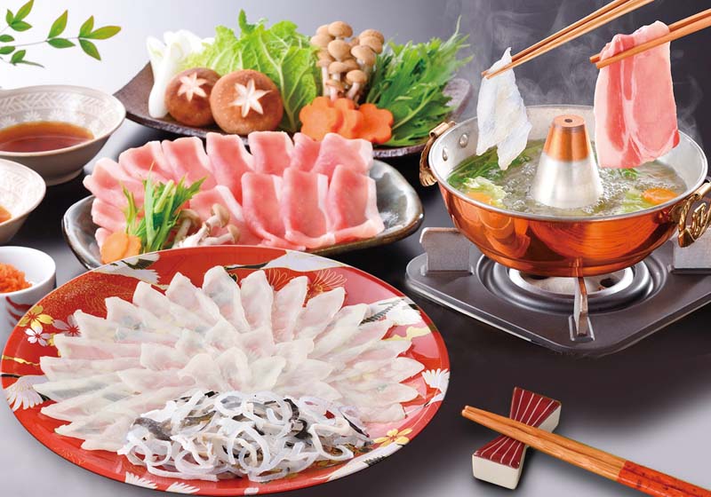 約2~3人前/真ふぐ霜降り刺身しゃぶしゃぶ用45g、とらふぐ皮20g、しゃぶしゃぶ用豚肉150g、ふくちりスープ300g、ふくポン酢・もみじおろし各10g×各3