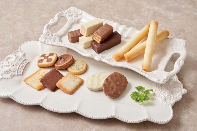 ミルフィーユ(ジャンドゥーヤ×2・ベリー×2・コーヒー)、ヴィーナービッセン(マカダミアナッツ・アーモンド・ヘーゼルジャンドゥーヤ・アーモンドジャンドゥーヤ)×各4、ツィガレッテン×4、アーモンドチョコレートクッキー(ミルク・ホワイト)×各2、ビスケット(チョコ&バター・チョコチップ・紅茶)×各2