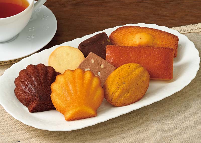 マドレーヌ(バター・ショコラ)×各4、フィナンシェ・ハニーマドレーヌ・マロンケーキ×各2、焼きショコラ(ミルクアーモンド・オレンジショコラ)×各2、プラリネショコラサブレ×2