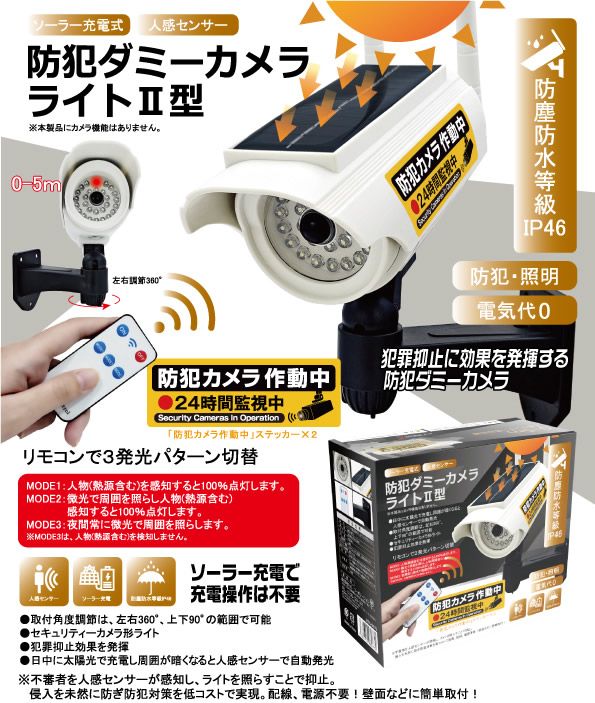 付属品:モード切替リモコン(テスト用電池CR2025含む)・「防犯カメラ作動中」ステッカー×2・取扱説明書・取付ビス(壁面用アンカー×3/ビス×3)