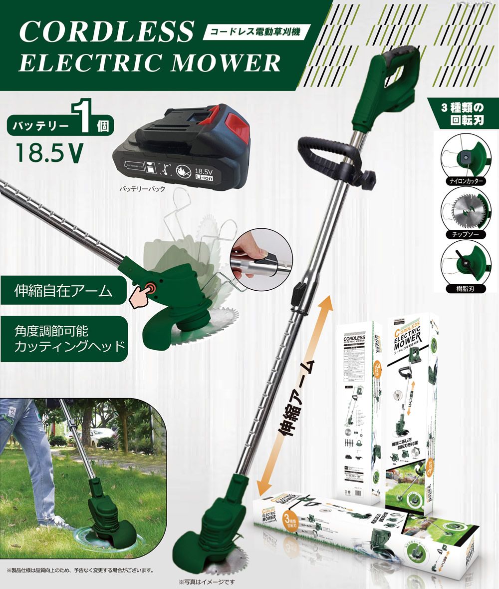 付属品:ハンドル、フロントガード、リアガード、樹脂刃(×5)、ワイヤーカッター(×2)、チップソー、刃取付ナット、ワッシャー(×2)、リアガード取付ネジ、六角ソケットレンチ、バッテリー、充電器、取扱説明書