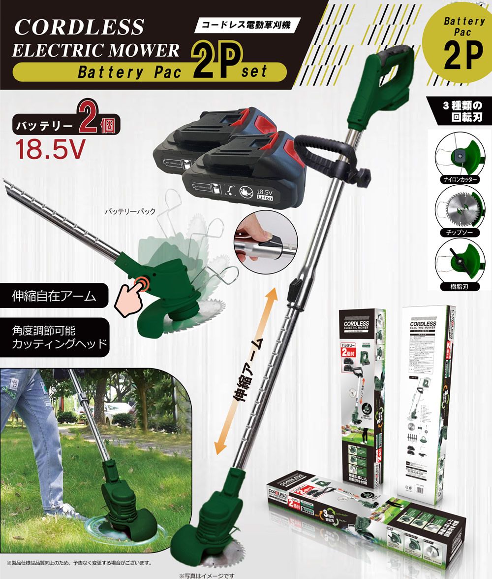 付属品:ハンドル、フロントガード、リアガード、樹脂刃(×5)、ワイヤーカッター(×2)、チップソー、刃取付ナット、ワッシャー(×2)、リアガード取付ネジ、六角ソケットレンチ、バッテリー×2、充電器、取扱説明書