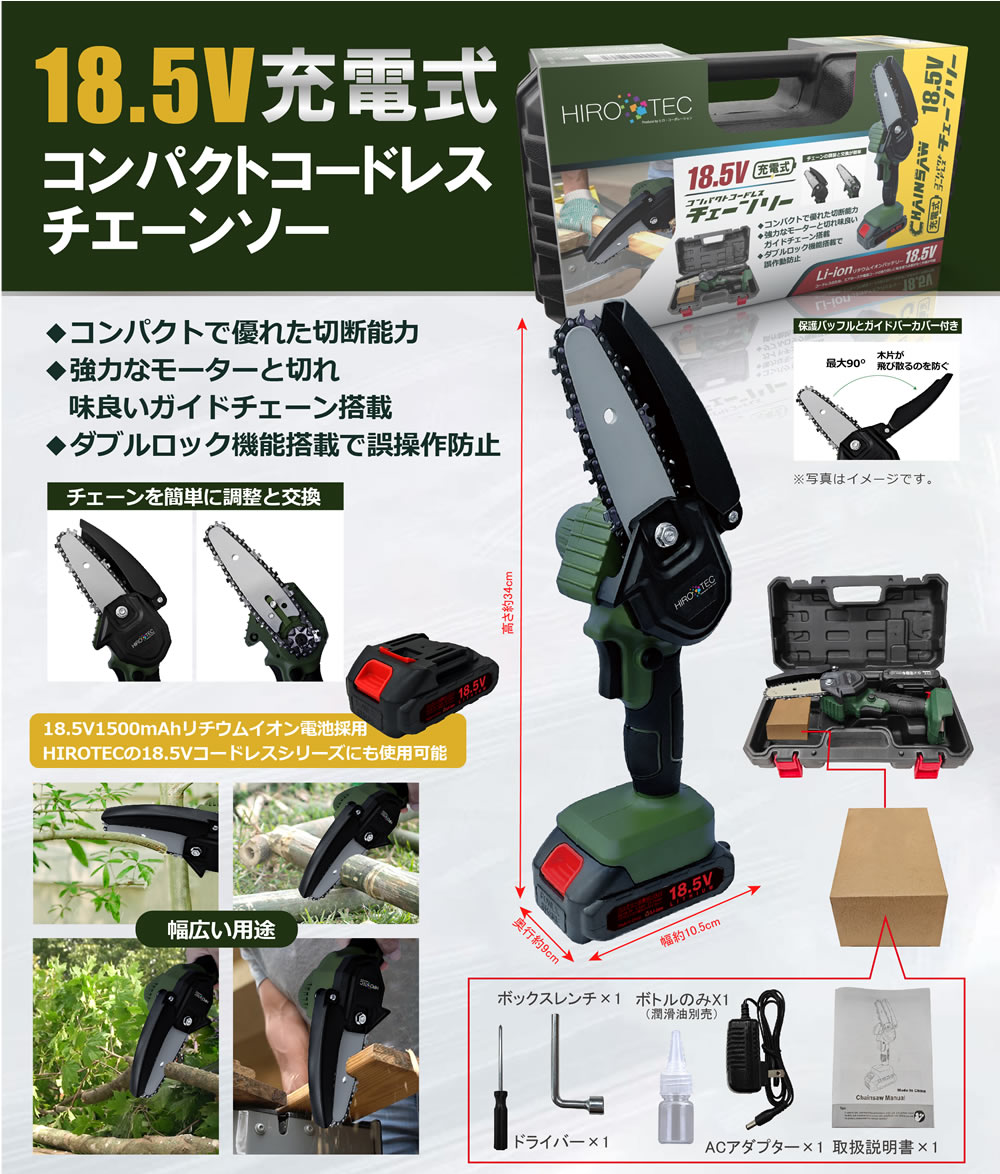 ・付属品:バッテリーパック、ACアダプター、プラスドライバー、ボックスレンチ、潤滑油ボトル(潤滑油別売)、専用収納ケース、取扱説明書