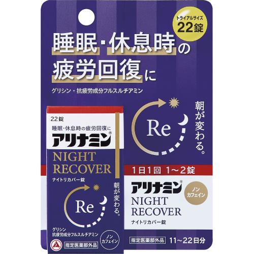 ●アリナミンナイトリカバー錠は、吸収にすぐれたビタミンB1誘導体フルスルチアミン、睡眠に関与するグリシン、疲労回復に関与するエゾウコギを配合。睡眠・休息時の疲労回復、栄養不良に伴う睡眠の質(眠りの浅さ、目覚めの悪さ)に改善にすぐれた効果をあらわします。