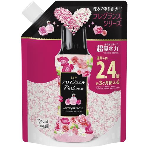 柔軟剤と比べて、超吸水力*&香り長続き2色の香水ビーズ。複雑で深みのある香り。柔軟剤より上質なフレグランスが香水よりやさしく、長く続きます。ローズの香水をイメージ アンティークローズの香り:上品なフローラルの中に、甘いピーチとアプリコットの温かさをブレンド。お洗濯のはじめに入れるだけ!縦型・ドラム式どちらでもOK通常※の約2.4倍 約3ヶ月使える^※アロマジュエル通常サイズ(420mL)