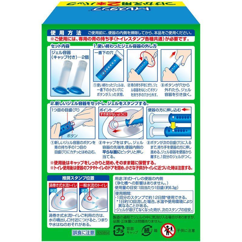 容器をセットする:ジェル容器のボタンを持ち手の1つ目の目盛(穴)にカチッとはめ込む。便器へ押し当てる:キャップをはがし、ジェル容器の先端を、便器内側の平らな面にピッタリと押し当てる。ジェルをスタンプする:便器へ押し当てたまま、ボタンを持ち手の穴に押し込みながら、次の目盛(穴)に入るまで、持ち手を便器の方に押し進める。ジェル容器を便器から離すと、1回分のジェルがつく。※使用後はキャップをしっかりと閉めて保管する。用途/水洗トイレ用 使用箇所/洋式トイレの便器の内側(浄化槽への影響はありません。)ジェルが溶けてなくなった時が、つけ替えの目安です。