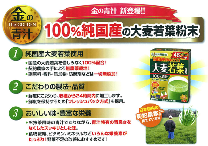 100%純国産の「金の青汁」超お徳用サイズ。契約農家の手で無農薬栽培された国産の大麦若葉を惜しみなく100%配合。副原料・香料・添加物・防腐剤などは一切無添加。鮮度にこだわり、収穫から24時間内に加工。さらに鮮度を保持するため、「フレッシュパック方式」を採用。お抹茶風味の味でありながら、青汁特有の青臭さがないスッキリとした味。食物繊維、ビタミン、ミネラルなどいろんな栄養素がたっぷり。野菜不足の改善におすすめです。